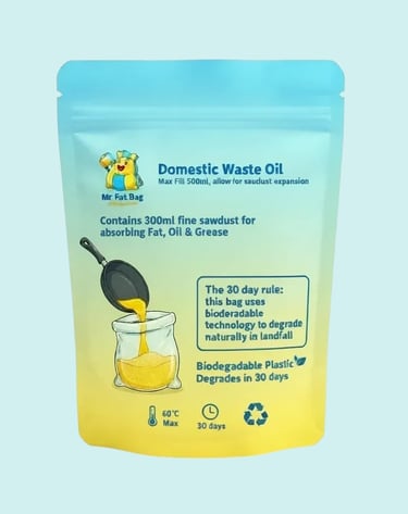 Mr Fat Bag is a biodegradable, home compostable pouch that soaks up kitchen grease, stopping fatbergs and saving your pipes.