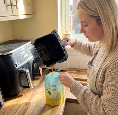 Instead of pouring the old oil into the sink, or into a plastic container (which then cannot be recycled), the fully home compostable pouch, can be placed in the food waste bin, and taken by the local authority, to incinerate to generate electricity, and avoid adding to landfill, which creates harmful Methane and CO2 greenhouse gases.