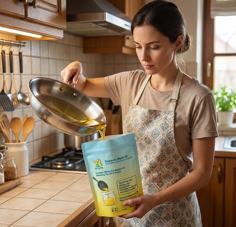 Simply pour your cooled oil into the pouch, where the sawdust, inside the pouch, will safely absorb and store it, for up to 30 days, allowing for multiple usage, holding up to 500ml of waste fat, oil and grease, before you can dispose of the pouch into your waste food bin.