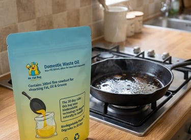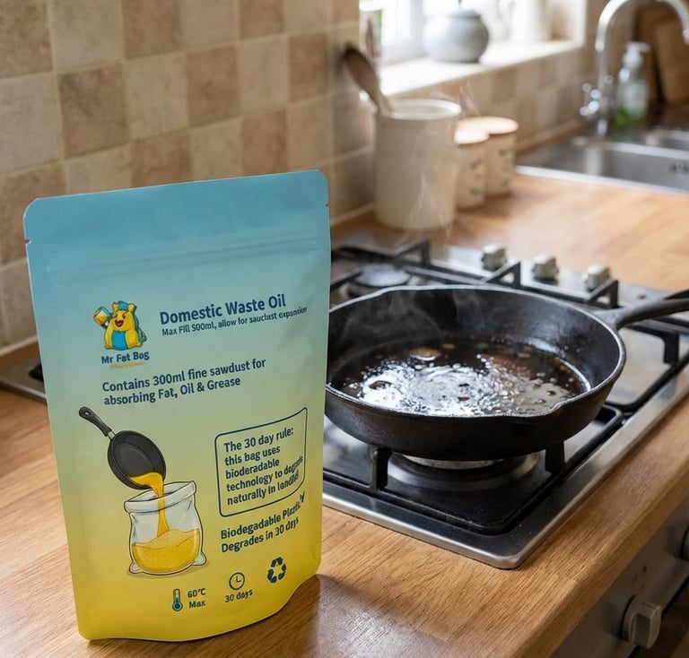 Mr Fat Bag tackles the problem of how to safely dispose of your waste fat, oil and grease. Usually people have to choose between pouring waste oil down the sink, or use glass or plastic containers to store it, and then place this in the normal waste bin.