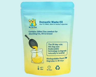 Each pouch holds sawdust that soaks up to 500ml of waste Fat, oil and grease. Each year, water companies spend around £100 million, unblocking and repairing pipes damaged by Fat. Households also face costly remedial work and repairs, by fat, oil and grease being poured down kitchen sinks.