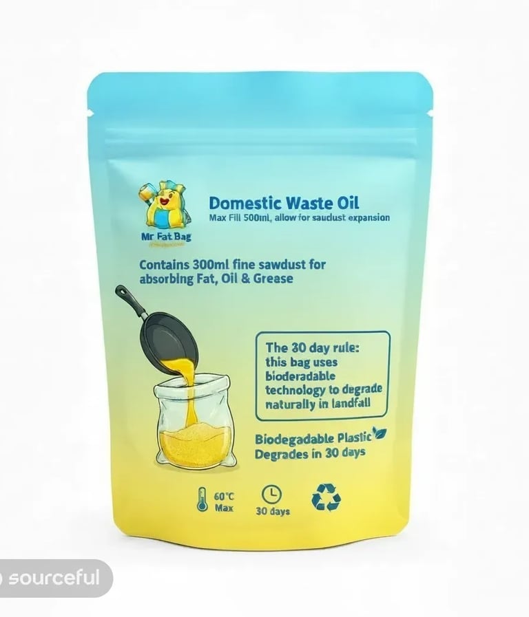 Mr Fat Bag is a biodegradable, home compostable pouch that soaks up kitchen grease, stopping fatbergs and saving your pipes.